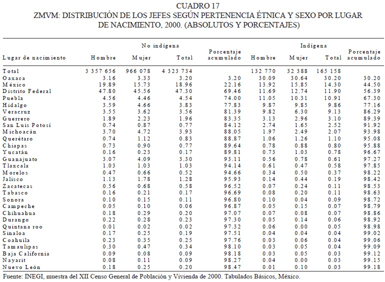 De los jefes de hogar indígenas de la ZMVM, 95 por ciento es originario de solamente 10 entidades del país. El grupo más numeroso reporta como su lugar de nacimiento el Estado de Oaxaca. Le siguen en orden de importancia los indígenas procedentes de municipios de las tres entidades que conforman la ZMVM (el Distrito Federal, el Estado de México e Hidalgo) aunque no necesariamente los que están conurbados. También tienen gran importancia como abortantes de inmigrantes a la ZMVM, los estados de Puebla, Veracruz, Guerrero, Michoacán, Querétaro y San Luis Potosí. Como ya se mencionó antes, los orígenes de la mayoría de los indígenas de la ciudad están situados básicamente en los estados del centro del país. De Chiapas y de la península de Yucatán, a pesar de ser entidades con poblaciones indígenas numerosas, hay relativamente pocos representantes. Y de los estados del norte del país, que por otro lado han tenido poblaciones indígenas relativamente reducidas desde la época prehispánica hasta la actualidad, no hay más que algunas pocas decenas de hablantes de las lenguas de esas regiones.