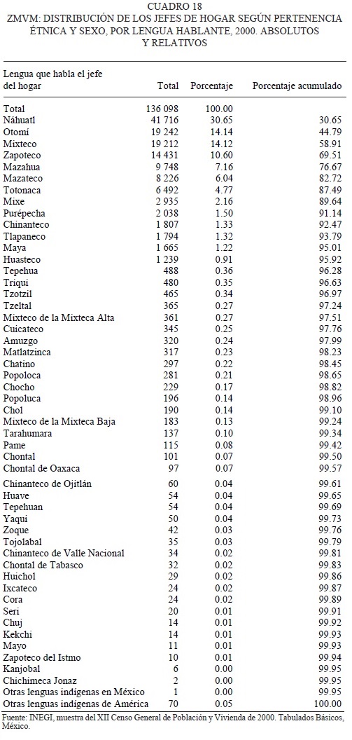 La lengua que hablan principalmente los jefes de hogar o sus cónyuges es el náhuatl. Pero el mixteco y el otomí están casi en igual posición como segunda y tercera lenguas más importantes. Las otras lenguas que tienen números importantes de hablantes como habitantes de la ciudad son zapoteco, mazahua y mazateco. Y, en total, son 13 las lenguas que tienen al menos mil o más representantes habitando la ZMVM. Todas las otras lenguas tienen menos de 500 hablantes dentro de la población metropolitana. Aparte de lo ya dicho, lo anterior vendría a mostrar que quizás los hablantes de las diferentes lenguas tienen tamaños de familias diferentes, en este caso más grandes, lo que haría que las posiciones relativas de las diferentes lengua cambien ligeramente según que se considere a todos los hablantes o solamente a los jefes de hogar o cónyuges indígenas. Sin embargo, en términos generales se conservan los órdenes de preeminencia de las diferentes lenguas tanto si se consideran los hablantes individualmente como si es a partir de los hogares.