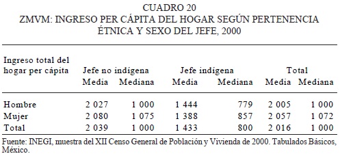 Los datos de ingreso tomados de la muestra no están presentados en salarios mínimos y, por lo mismo, la comparabilidad en el tiempo puede ser complicada. Sin embargo, las cifras de los cuadros 19 y 20 muestran que los jefes de hogar indígenas percibían, cuando se levantó el censo del 2000, salarios aproximadamente 30 por ciento más bajos que los que recibían los no indígenas. En el caso de las mujeres indígenas, jefas de hogar, el diferencial era de 35 por ciento con respecto a lo que ganaban las jefas de hogar no indígenas. Ello, a pesar de que, como ya se vio a nivel individual, los indígenas aparentemente ocupan las mismas posiciones en el trabajo que los no indígenas aun y cuando sí hay cierto mayor porcentaje de indígenas empleados como jornaleros y peones, y un número de indígenas menor que el de no indígenas declararon ser patrones. Si la mayoría de los jefes de ambos grupos declaran tener trabajos similares, es obvio que a los indígenas se les paga una cantidad menor por el mismo trabajo desempeñado. Aunque esto también podría tener que ver con su menor nivel de escolaridad relativo respecto de los no indígenas, como se verá más adelante.