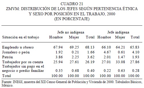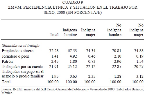 La mayor parte de los indígenas trabajan como empleados u obreros por cuenta propia (67.53 por ciento), probablemente en el mercado informal (25.12 por ciento) y casi cinco por ciento trabaja como jornalero o peón. Muy pocos alcanzan la categoría de patrones. Aunque las cifras mostrarían un pequeño margen en favor de los no indígenas, no hay grandes diferencias entre ellos.
