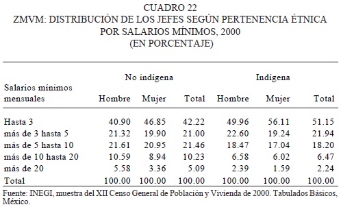 El ingreso medido por salarios mínimos está igualmente distribuido en forma desigual y hay más jefes de hogar indígenas en las escalas más bajas y menos en las más altas, al menos comparados con los no indígenas. Así, poco más de 51 por ciento de los indígenas reciben un máximo de tres salarios mínimos contra 42.2 por ciento de los no indígenas en esta situación, casi nueve puntos menos. Entre tres y cinco salarios mínimos hay bastante similitud, pero a partir de ahí las cifras favorecen a los no indígenas. Y aunque el número de no indígenas que reciben más de 20 salarios mínimos es solamente de 5.1 por ciento, esto es más del doble que lo que representan los indígenas, pues de ellos solamente 2.2 por ciento está en esta situación. Por supuesto, si las mujeres en general tienen salarios más bajos que sus contrapartes masculinas, las mujeres indígenas están por abajo, incluso, que las mujeres no indígenas en todas las posiciones. Simplemente como muestra, dentro del grupo que gana hasta tres salarios mínimos, entre las mujeres jefas de hogar indígenas y las no indígenas hay casi 10 puntos porcentuales de diferencia. En ambos casos ganan menos que los hombres de sus respectivos grupos, pero ganan aún menos las mujeres indígenas tanto con respecto a las mujeres no indígenas como respecto de los hombres indígenas. Su situación es, pues, aún más difícil en cuanto al nivel de ingreso.