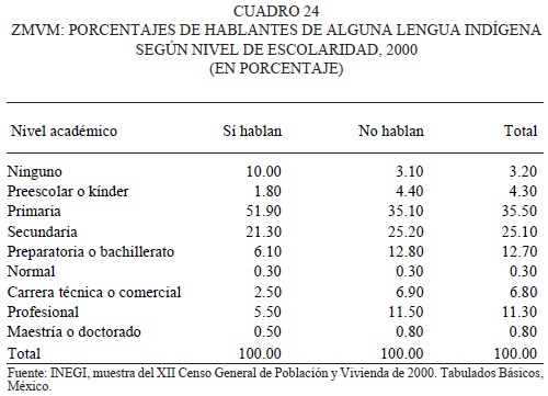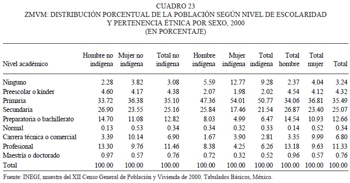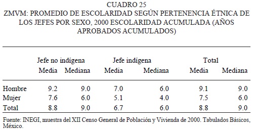 Pese a que la situación de los indígenas de la ZMVM en cuanto a escolaridad y posición en el trabajo presenta menores niveles que la que tiene la población no indígena, en términos generales las diferencias no son tan marcadas como se puede observar en estados y municipios con una población indígena importante o mayoritaria. No obstante, 50 por ciento de los hombres y mujeres jefes de hogar indígenas no alcanzan más que la primaria como nivel de escolaridad y en promedio tienen seis años de escuela. Así, en términos generales, los jefes de hogar indígenas tienen dos años menos de escolaridad que los no indígenas.
