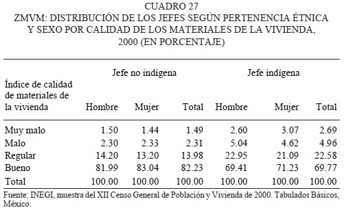 En cambio, para los jefes no indígenas, poco más de 50 por ciento de sus viviendas son 'buenas', 33 por ciento 'regulares'; solamente 12 por ciento entran en la categoría de 'malas'y 3.47 por ciento en la de 'muy malas'. También en este caso, pese a que las viviendas de las mujeres jefas de hogar indígenas presentan baja calidad del espacio, tienen, sin embargo, mejores índices que las de los jefes hombres, tanto en el caso de los no indígenas como de los indígenas.
