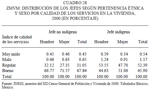 En el caso de los servicios en la vivienda, este aspecto presenta aún más carencias y problemas que en la situación ya descrita con respecto a los materiales. El grueso de las viviendas de hogares indígenas entra dentro de la categoría de 'regular' (52.4 por ciento) y solamente 45.9 por ciento dentro de la categoría de 'buena'. Por su parte, en el caso de los hogares no indígenas, la mayoría de sus viviendas entra dentro de la categoría de 'buenas' y poco menos de un tercio entra en la categoría de 'regular'. Tanto para los indígenas como para los no indígenas, las viviendas con malos servicios son relativamente pocas. En la categoría de 'muy malas' apenas se encuentran 0.5 por ciento de las viviendas de ambos grupos. Y en la de 'malas' aunque sube a 1.17 por ciento para los indígenas, realmente es un porcentaje muy bajo. Con todo, este último valor es del doble del que presentan los no indígenas. Y, al igual que en el caso anterior, las viviendas de hogares dirigidos por mujeres presentan un margen mayor de calidad en sus servicios que las dirigidas por hombres: entre cuatro y cinco por ciento más viviendas de mujeres son 'buenas'.