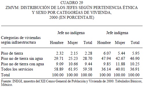Como complemento del subíndice anterior, se analizó el porcentaje de viviendas según su infraestructura, considerando el tipo de piso y si tenían agua o si contaban con todos los servicios. Aquí nuevamente los hogares indígenas mostraron fuertes rezagos en relación a los no indígenas. Así, un número importante de viviendas de jefes indígenas, casi seis por ciento, tenían piso de tierra, mientras que hasta 47 por ciento contaban con piso de un material diferente a la tierra (y por lo mismo sería esperar que de mejor calidad), sin embargo, no contaban con agua en el domicilio. Las viviendas que contaban con todos los servicios eran solamente 37 por ciento, lo que contrasta con las viviendas de los no indígenas, que contaban con todos los servicios en un porcentaje cercano a 60 por ciento. Aquí nuevamente es de llamar la atención el hecho de que las viviendas de las mujeres jefas de hogar, tanto indígenas como no indígenas, tienen mejor infraestructura que las de los jefes hombres de sus respectivos grupos étnicos.