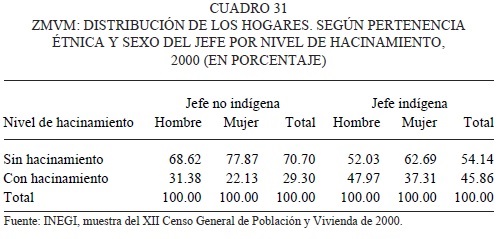 Como complemento de este subíndice, el cuadro 31 muestra el nivel de hacinamiento de las viviendas. En 45.9 por ciento de las viviendas indígenas existe hacinamiento, contra solamente 29.3 por ciento de las no indígenas. Las viviendas de hogares jefaturados por mujeres tienen niveles de hacinamiento de entre nueve y diez por ciento menores que los dirigidos por hombres. Aquí habría que recordar que esto en parte podría deberse a que, como se ha reportado por muchos investigadores, los hogares dirigidos por mujeres suelen tener un miembro menos que los dirigidos por hombres, por la falta del cónyuge en la mayoría de los casos.