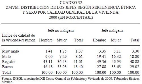 Es importante hacer notar que este rubro de calidad depende más de los servicios proveídos por el sector público que de los propios ingresos de los hogares. Lo que quizá nos está hablando de que los hogares dirigidos por indígenas están ubicados en zonas menos urbanizadas o de mayor marginación en la propia ZMVM.