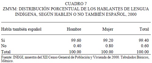 Por otro lado, la casi totalidad de los indígenas de la ZMVM que hablan una de esas lenguas declararon que también hablaban español y sin que se registraran mayores diferencias según el sexo. Si bien éste no es el caso de muchos hablantes de lenguas indígenas en otras regiones, sobre todo de las mujeres, en la capital del país esto es explicable porque hablar el español, aparte de una lengua nativa, es muy necesario, casi indispensable para la interacción social y económica. Los que nacieron en esta zona asistieron a escuelas en donde el idioma que se utilizaba era el español; los que llegaron desde otras regiones tienen que haber vivido la necesidad de hablar el idioma citadino y lo aprendieron en el curso de su experiencia. Por otro lado, hay que recordar que las personas que toman la decisión de migrar suelen ser precisamente aquéllas con mayores niveles de escolaridad en sus lugares de origen y, además, suelen ser personas con mayores niveles de adaptabilidad e iniciativa personal. Así que es probable que muchos de ellos ya supieran español cuando llegaron a la ZMVM.