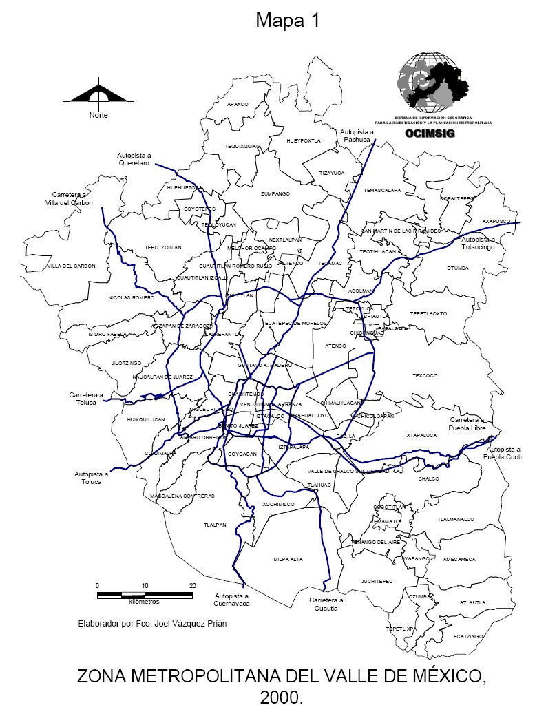 Por otro lado, el concepto de ciudad que se utilizó fue el de la Zona Metropolitana del Valle de México (ZMVM). Esta comprende las 16 delegaciones del Distrito Federal, 58 municipios del Estado de México y un municipio del estado de Hidalgo (mapa 1). Estos municipios son los que se consideran ya conurbados a la Ciudad de México y se consideran los criterios adoptados por el Plan de Ordenación de la Zona Metropolitana del Valle de México (ver bibliografía).1