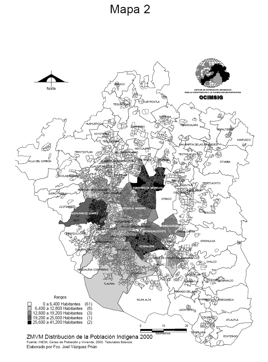 La mayor parte de los indígenas metropolitanos (80.58 por ciento) se concentran en solamente 20 de las 75 delegaciones y municipios de la ZMVM (cuadro 4), mismas que también concentran 76.4 por ciento de la población total de la metrópoli. En general, todas estas entidades federativas, son las de más antiguo poblamiento y están relativamente cercanas entre sí y al centro de la ciudad (mapa 2). Entre estas, once de las 16 delegaciones del Distrito Federal y nueve municipios conurbados (de 59). La más alta concentración de población indígena se puede encontrar en la delegación de Iztapalapa (10.48 por ciento) seguido por cuatro municipios mexiquenses y otra delegación del Distrito Federal, estos últimos casos albergan entre cinco y nueve por ciento de los indígenas de la ciudad.