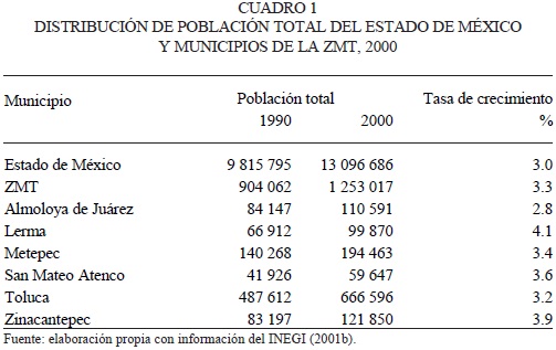 De acuerdo con el XII Censo de población, en el año 2000 existían 13 096 686 habitantes en el Estado de México, de los cuales 1 253 017 personas (9.6 por ciento de la población estatal) residían en la ZMT. Los municipios más poblados de esta región son Toluca y Metepec. El primero de ellos tiene 666 596 habitantes (53.2 por ciento de las residentes en la ZMT), mientras que en Metepec viven 194 463 personas, que conforman 15.5 por ciento de la población de esta zona.