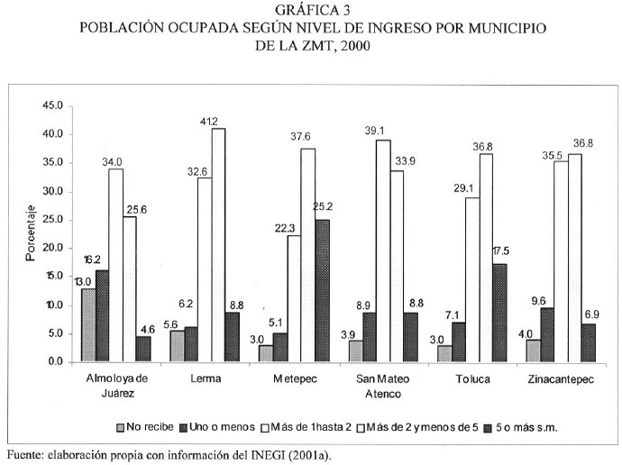 El dato más grave en cuanto al nivel de ingresos en todos los municipios de la ZMT está constituido por las 3 446 personas que laboran en Almoloya de Juárez sin percibir ningún ingreso, esto es, 13 por ciento de la población ocupada en ese municipio. Además, en Almoloya de Juárez, 34 por ciento de la población ocupada percibe entre uno y dos salarios mínimos. Sólo San Mateo Atenco supera a Almoloya en cuanto a concentración en ese rango de ingresos, pues en ese municipio 39.1 por ciento de la población ocupada gana entre uno y dos salarios mínimos; en descargo, sólo 3.9 por ciento de la población ocupada trabaja sin percibir ningún ingreso en este municipio.
