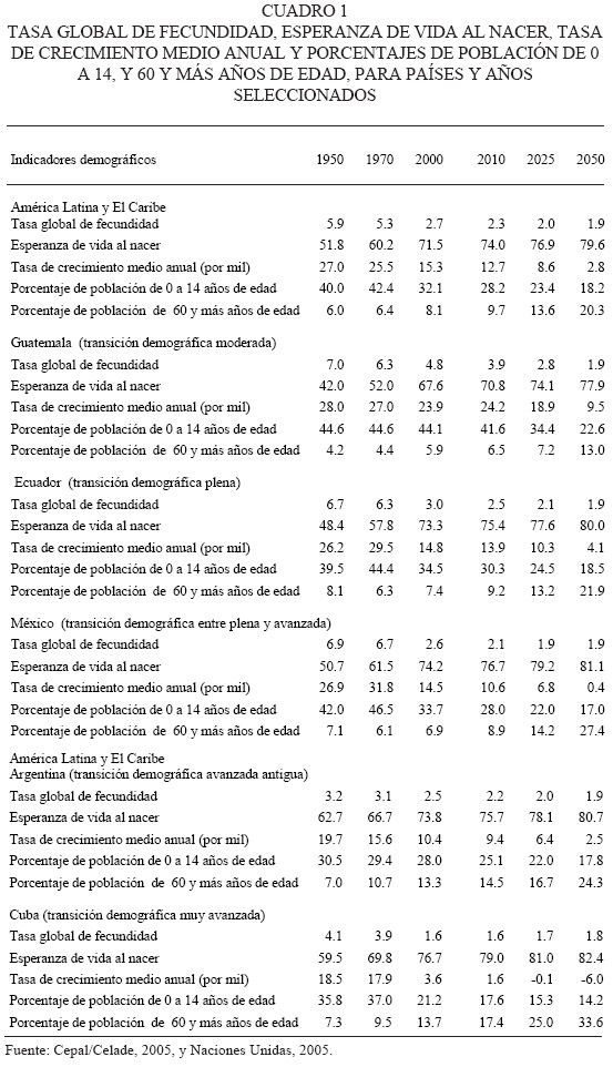 En el cuadro 1 se pueden apreciar algunos indicadores demográficos de países seleccionados según distinta etapa en el proceso de transición demográfica. Ciertamente, lo que se refiere al futuro son hipótesis que son constantemente revisadas a la luz de la nueva información (Cepal/Celade, 2005, Naciones Unidas, 2005). En el cuadro pueden observarse las tendencias de la fecundidad y la mortalidad y, con cierto desfase, las consecuencias sobre el crecimiento y la estructura por edades de la población. A medida que se avanza en la transición se produce una contracción del porcentaje de niños y un paulatino aumento del porcentaje de la población de adultos mayores.