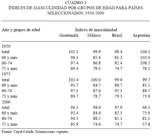En el cuadro 3 se presentan, para el periodo 1950-2000, los datos correspondientes al índice de masculinidad del total de la población y a edades avanzadas en países seleccionados. En todos los casos, y en los años analizados, se observa el bajo índice de masculinidad que confirma la mayor presencia de mujeres y, además, que es menor a medida que se considera una edad más avanzada. Por ejemplo, en Brasil, mientras para el grupo 60 a 74 el índice es de 84 hombres por cada 100 mujeres en el año 2000, para el grupo de edad de 75 y más el indicador para el mismo año es de 70 hombres por cada 100 mujeres.