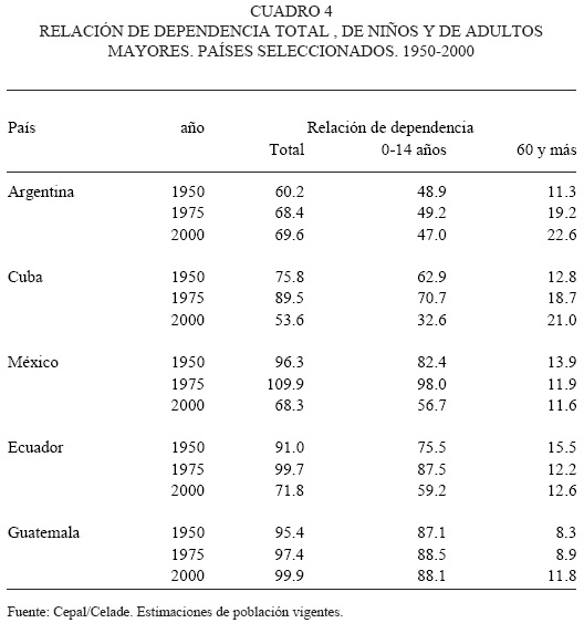 También hay que considerar el rol que juega en todo esto el cambio en la composición interna de la relación de dependencia demográfica, ya que está compuesta por la relación de niños y la de los adultos mayores. Al descender la fecundidad y estancarse el crecimiento de los niños, consecuentemente la relación de dependencia correspondiente a la población de cero a 14 años de edad se hace menor (cuadro 4).