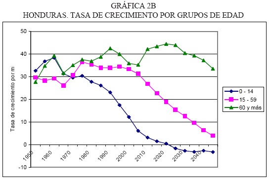 Para Honduras, que inicia este proceso más tardíamente (la convergencia se produce en el quinquenio 1975-1980), se espera que la tasa de crecimiento de los niños sea negativa recién cerca del año 2030, mientras que en esa época la población adulta mayor superaría 40 por mil de crecimiento medio anual.