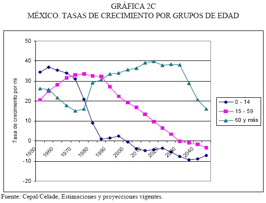 A partir del inicio de la disminución de la fecundidad, generalmente a mediados de la década de 1960 comienza el gradual envejecimiento de la población. Como se mencionó antes, este proceso es producido por la tasa de crecimiento diferenciada según la edad, que muestra un pronunciado descenso de la correspondiente a niños y un aumento en el ritmo de crecimiento de las personas adultas mayores (gráfica 2).