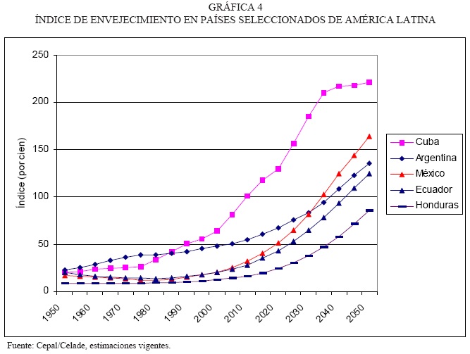 Sin duda, el caso más espectacular es el de Cuba, que de 20 adultos mayores por cada 100 niños en 1950, pasa a 65 por cada 100 en el año 2000, superando ampliamente a Argentina, que continúa su proceso de envejecimiento en forma sostenida, pero gradual. Por otra parte, en México y Ecuador, países con transición plena reciente, el índice pasa de aproximadamente 14 adultos mayores por cada 100 niños en 1965, a un índice de 20 por cien en el año 2000.