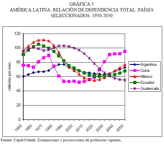 En los inicios de la transición demográfica, la relación de dependencia es alta por el elevado porcentaje de niños. En la gráfica 5 puede observarse que su valor en Guatemala, en toda la segunda mitad del siglo pasado, es de aproximadamente 100 potencialmente pasivos por cada 100 en edad activa. Se observan valores similares, y aún mayores, para México y Ecuador hasta 1980 y 1975, respectivamente. Sin embargo, Argentina, que tiene una población con menor proporción de niños durante todo el periodo, presenta una relación en torno a 70 por 100. Pero lo que más llama la atención en esta gráfica es la tendencia de los países a la disminución de la relación de dependencia a valores por debajo de 60 por 100. Este hecho ya estaría sucediendo en algunos países que están en un estadio más avanzado de la transición (por ejemplo, Cuba) y se prevé que ocurra en los demás. El caso de México se destaca por la velocidad e intensidad del descenso de su relación de dependencia, que estaría ya muy próxima a 60 por 100.