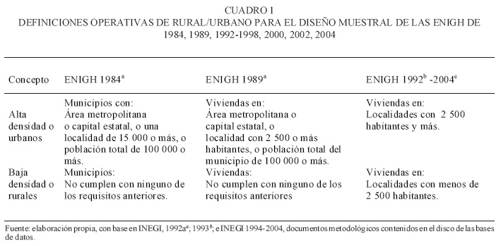 Otro de los problemas que se derivan de las alteraciones en el diseño de la muestra y que dificultan la comparación entre algunas ENIGH se deriva de los cambios en el umbral de tamaño para definir a las localidades rurales y urbanas. Por ejemplo, entre 1984 y 1989, las definiciones se realizaban de acuerdo con alta/baja densidad, considerando el umbral los 15 000 habitantes. Sin embargo, mientras en la ENIGH 1984 los criterios son claros, en la ENIGH de 1989 existe una contradicción en cuanto a la definición de baja densidad.9 Entre 1992 y 2004, la definición del umbral urbano/rural ha sido el de localidades mayores/ menores a 2 500 habitantes. En 2000 y 2002 la encuesta incluyó en su marco muestral a las áreas metropolitanas de la Encuesta Nacional de Empleo Urbano (ENEU), no obstante, el documento metodológico de 2004 no aclara si éstas continúan considerándose.