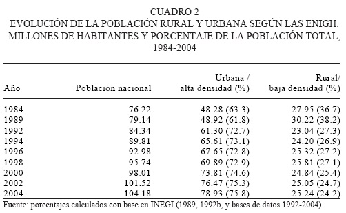 Los cambios en la definición de lo urbano y rural, en combinación con los del marco muestral, dan como resultado una evolución absurda de la población urbana y rural de México. Como se observa en el cuadro 2, no es coherente la evolución de la población urbano/rural durante 1984-1989, 1989-1992, 2000-2004. En 1984-1989 el aumento total de la población se clasifica como de baja densidad/rural. Esto se debe a que en 1989 no toda la población de los municipios que se definieron como de alta densidad se clasificó como tal (como fue el caso en 1984), sino sólo aquéllas que vivían en localidades con más de 2 500 habitantes. Esto lleva a una subestimación de la población de alta densidad.
