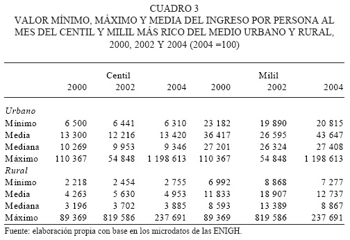 Las fluctuaciones en la parte más alta de la pirámide de ingresos provocan fuertes cambios en la media del ingreso. Por ejemplo, el ingreso medio por persona al mes del milil urbano pasó de 36 mil cuatrocientos pesos, a 25 mil seiscientos pesos y a 43 mil seiscientos pesos en 2000, 2002 y 2004, respectivamente. Lo mismo sucede con el milil rural (cuadro 3). No obstante, las medianas permiten ver que los más ricos del país están subrepresentados. De esta forma, los hogares más "ricos" del país tienen una mediana de 27 mil cuatrocientos pesos por persona al mes en el medio urbano y de 8 800 pesos en el rural en 2004.13 Nótese, por otro lado, las enormes fluctuaciones de los valores máximos en la encuesta de un año a otro (cuadro 3). El ingreso más alto por persona en el medio urbano en 2000 fue de un poco más de 110 mil pesos, pero cae a 55 mil en 2002, y aumenta a casi un millón 200 mil pesos en 2004. La proporción de estas fluctuaciones también se presenta en el medio rural.
