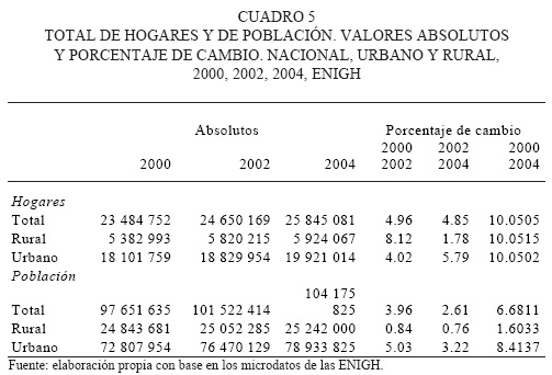 En términos del tamaño del hogar, nos enfrentamos una vez más a fluctuaciones de magnitud considerable. Entre 2000 y 2002 se observa un elevadísimo crecimiento del número de hogares, sobre todo en el medio rural (ocho por ciento), muy por arriba del crecimiento de los hogares urbanos (cuatro por ciento), cuando la población rural crece menos de uno por ciento. En cambio, entre 2002 y 2004, el crecimiento del tamaño del hogar fue de 1.8 por ciento, aumento menor al urbano (de 5.8 por ciento, véase cuadro 5).