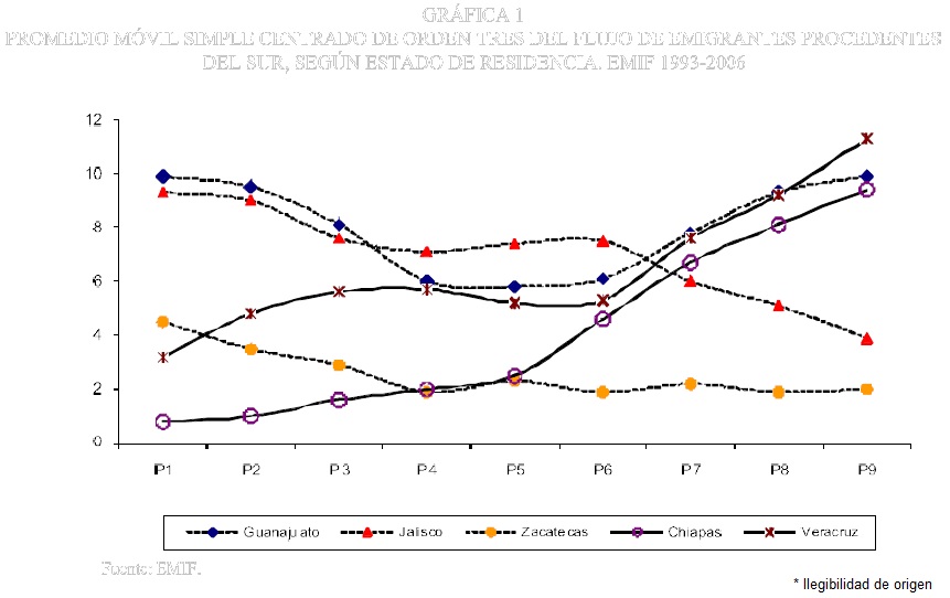 A partir de agrupar las fases anuales de levantamiento de la encuesta entre 1993 y 2006, y luego de establecer promedios móviles simples de orden tres, la gráfica 1 permite apreciar la participación de los emigrantes procedentes del sur3 que se desplazaban con destino a la frontera norte mexicana o hacia Estados Unidos, y comparar el comportamiento de tres entidades de reconocida y larga tradición migratoria internacional hacia el vecino país del norte, Guanajuato, Jalisco y Zacatecas, con otras dos de nueva participación: Chiapas y Veracruz.
