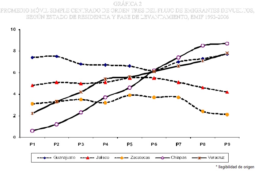 Por su parte, Veracruz y Chiapas muestran notorios ascensos en su participación en el flujo de emigrantes devueltos. Llama la atención que en los últimos tres registros fue precisamente Chiapas la entidad que aportó la mayor proporción al conjunto de estas cinco entidades seleccionadas, lo que indica que su población se está integrando crecientemente a la emigración internacional, pero que sus migrantes son menos exitosos tratando de internarse sin documentos e intentando permanecer en el vecino país. Entre los migrantes que en años recientes han sufrido las mayores tragedias tratando de cruzar la frontera hacia Estados Unidos en forma encubierta o subrepticiamente, los chiapanecos ocupan las primeras posiciones.