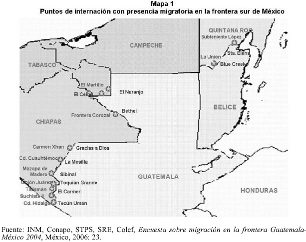 INM, CONAPO, COLEF, SEGOB, STPS y SRE, 2006, Encuesta sobre migración en la frontera Guatemala-México 2004, México. [ Links ]