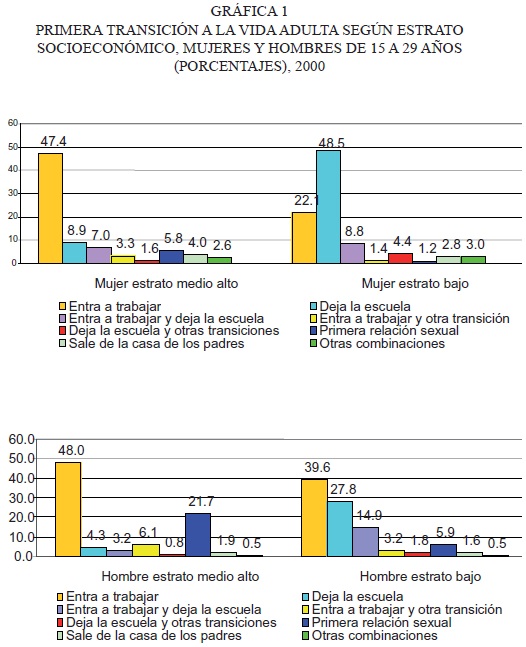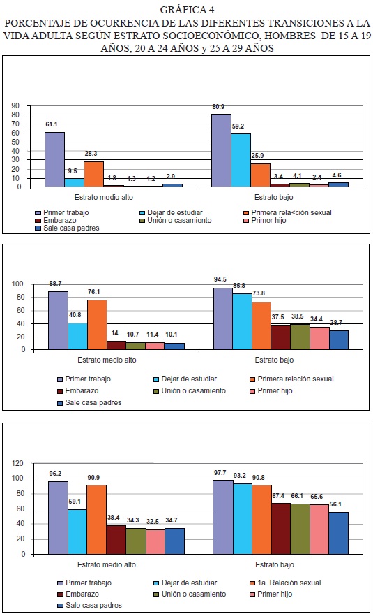 Las desigualdades socioeconómicas dejan, de igual forma, huellas marcadas en el proceso de transición a la adultez. Los jóvenes, sean hombres o mujeres, que enfrentan una mayor escasez de recursos económicos han transitado por estos eventos en mayores proporciones y a edades más tempranas. Con la excepción de la entrada al mercado de trabajo, en todos los demás eventos, las discrepancias entre estratos sociales son más acentuadas cuando comparamos a las mujeres. Aspecto que denota que la interrelación entre el estrato socioeconómico y la condición de hombre o mujer contribuye a la acumulación de desventajas para las jóvenes de los estratos bajos.
