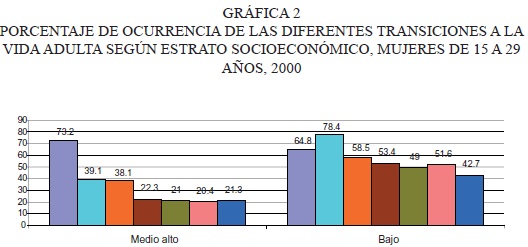 Las mujeres jóvenes del estrato medio-alto permanecen más tiempo en la escuela, alcanzan niveles de escolaridad mucho más elevados, participan en mayor medida en el mundo laboral, han logrado una mayor desvinculación entre la sexualidad y la procreación, y se casan, se embarazan y tienen hijos a edades más tardías que las jóvenes del estrato bajo. En los estratos más desfavorecidos económicamente, las jóvenes dejan prematuramente la escuela, inician su vida sexual a edades más tempranas y también se embarazan, se unen y tienen hijos aun siendo muy jóvenes.