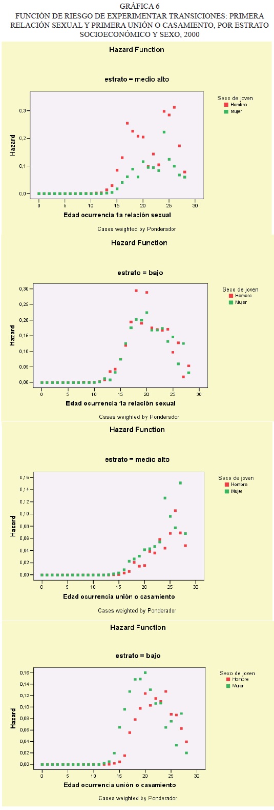 16 Las cifras revelan que los varones presentan un mayor riesgo de transitar por estos eventos entre los 23 y los 25 años de edad en el estrato bajo; y entre los 26 y los 28 años en el medio-alto. Las mujeres, a su vez, lo hacen de los 20 a los 21 años de edad en el estrato bajo; y de los 25 a los 27 años en el medio-alto.