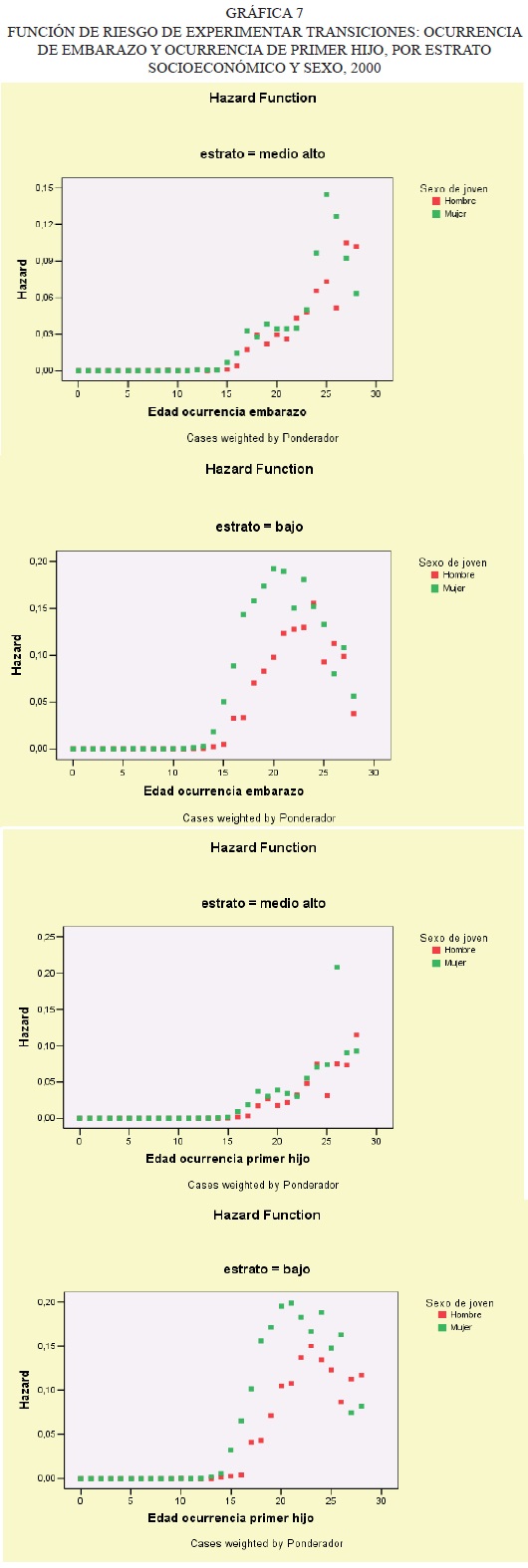 Los eventos-transición vinculados con la unión conyugal, primer embarazo y primer hijo, muestran diferencias persistentes y recurrentes entre hombres y mujeres. Estas diferencias atraviesan los estratos sociales analizados. No obstante, hay que señalar que pese a ello, los contrastes entre estratos sociales son también acentuados. Queremos resaltar tres resultados que son congruentes con el conocimiento acumulado sobre las transiciones familiares: a) las mujeres jóvenes, sin importar el estrato social, se unen, embarazan y tienen el primer hijo en mayores proporciones y a edades más tempranas que los varones (gráficas 2, 6 y 7); b) estas diferencias entre hombres y mujeres jóvenes son aún más acentuada en el estrato bajo que en los sectores medios altos, y c) los contrastes entre estratos sociales se manifiestan en forma aún más clara cuando se comparan las mujeres entre sí. En efecto, en los estratos bajos las personas jóvenes, y muy especialmente las mujeres, se unen, se embarazan (o embarazan a su novia o pareja), y tienen hijos en mayor proporción y a edades más jóvenes que en el estrato medio-alto (gráfica 2, 6 y 7).16