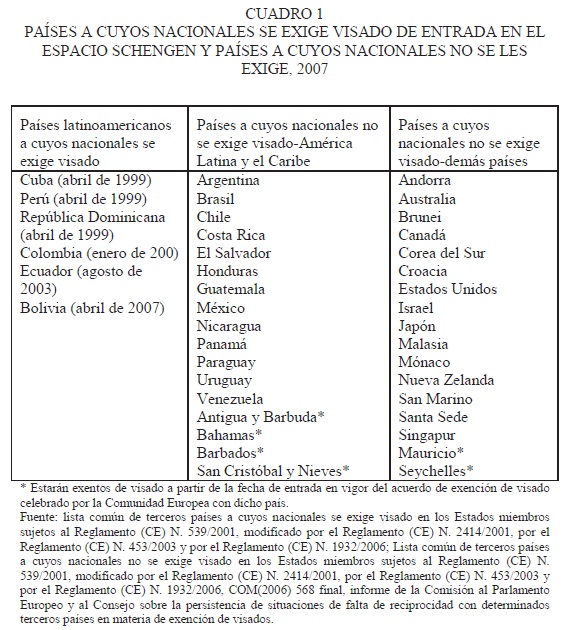 En teoría, la exigencia de visado supone un mayor control del ingreso de inmigrantes que puede generar una disminución en los flujos hacia España y una mayor selectividad de los mismos, lo que, en otras palabras, favorecía la entrada de inmigrantes documentados (Durán, 2003). Si nos fijamos en el cuadro 1, destaca el numero de países latinoamericanos todavía exentos de la obligación de presentar un visado para entrar en el espacio Schengen, tanto en su número, muy superior al de las demás regiones en desarrollo, como en el potencial migratorio que podría suponérseles, dado el tamaño de su población y los lazos históricos y demográficos con España, surgidos de la emigración española a esos países.