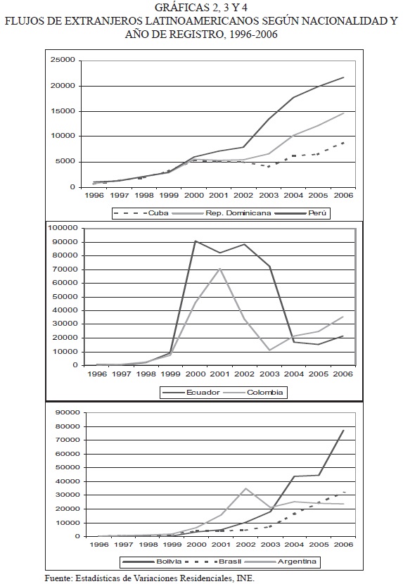 En líneas generales, se puede dividir los flujos contemporáneos desde Latinoamérica en cuatro periodos: a) 1975-1991, donde los flujos corresponden mayoritariamente a los ciudadanos argentinos, chilenos y uruguayos que llegaron huyendo de las dictaduras que a mediados de la década de 1970 se instauraron en sus correspondientes países; b) 1992-1999, cuando peruanos y dominicanos encabezan las migraciones económicas, claramente feminizadas; c) 2000-2005, periodo caracterizado por la gran aceleración de la migración latinoamericana con destino a España, protagonizada principalmente por ecuatorianos y colombianos; y, d) a partir de 2006, donde nuevos flujos, como los bolivianos y brasileños, desbancan a los anteriores de las primeras posiciones (véase gráficas 2, 3 y 4). Para los objetivos de este estudio, nos concentraremos en la segunda y tercera etapas.