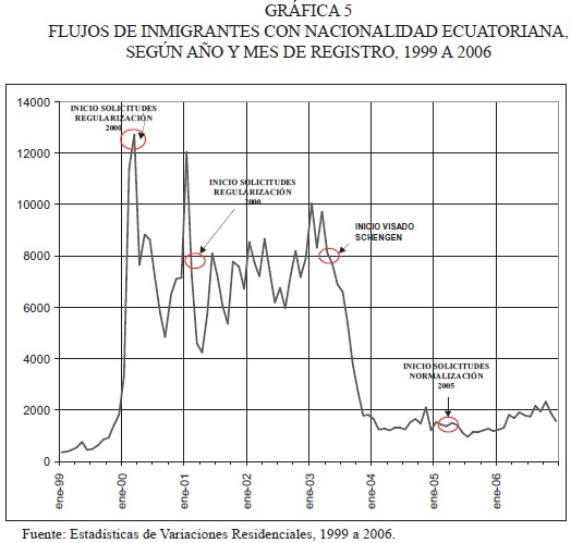 Entre 1999 y 2000 se experimenta un espectacular aumento de los flujos de ecuatorianos hacia España: de 8 992 entradas anuales llegan a las 91 141 entradas, que se aceleran a partir de enero de 2000. El comportamiento de los flujos es bastante regular hasta fines de 2001: la mayoría de los registros ocurren entre enero y marzo de cada año, coincidiendo con las vacaciones de verano y el fin del año escolar en este país. Además, en estos dos años probablemente muchos individuos que no se encontraban empadronados lo han hecho teniendo en cuenta que el empadronamiento figuraba como requisito para las regularizaciones que se llevaron a cabo. En el año 2002 se observa una estabilización de las entradas, que crecen en los primeros meses de 2003 debido al efecto llamada del anuncio del requisito de visado de entrada a España. A partir de la entrada en vigencia del requisito, en el primero de abril de 2003, los flujos caen de forma acentuada, estabilizándose a partir de finales de este año. A finales de 2004 se observa otro aumento aunque menos acentuado (véase gráfica 5).