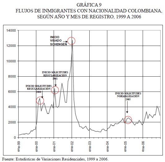 Los flujos de ecuatorianos y colombianos, el primero más reciente que el segundo, sufren el impacto de la exigencia de visado sobre el volumen de entradas y sobre su estructura por sexo y edad. Ambas nacionalidades presentaron un crecimiento acentuado de sus flujos a partir de finales de la década de 1990: los ecuatorianos han sido el flujo de mayor volumen durante 2000 a 2003 entre todas las nacionalidades y Colombia el segundo mayor flujo entre 2000 y 2001. Entre los años 2000 y 2007, Ecuador y Colombia ocupan el tercer y cuarto lugares respectivamente en el ranking de nacionalidades con mayor número de registros de entrada en España, por debajo solamente de los flujos de rumanos y marroquíes.