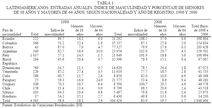 Durante la década de 1990 se destacan los flujos de colombianos, peruanos, dominicanos y cubanos, así como el predominio de mujeres entre los mismos, lo que ha sido la característica fundamental de esta etapa de la migración latinoamericana en comparación con los demás flujos de inmigrantes, lo cual guarda estrecha relación con la existencia de una demanda de mano de obra inmigrante en nichos laborales tradicionalmente feminizados, como el del servicio doméstico y el cuidado de ancianos. (Domingo y Martínez, 2006; Pérez, 2004). Conforme se observa en la tabla 1, en 1996 los flujos estaban claramente feminizados: entre el conjunto latinoamericano, para cada 100 mujeres habían sido registrados 58.6 hombres en el año.
