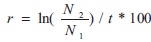 Donde ln es logaritmo natural (base e); N2 es la población final; N1 es la población inicial, y t, tiempo (en años exactos).