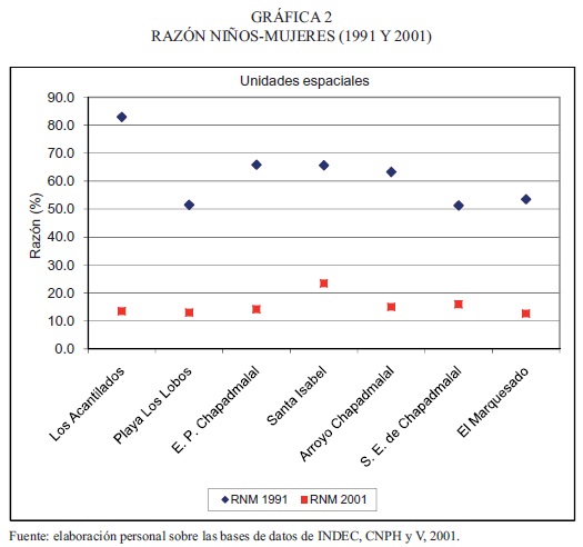 La base de datos correspondiente al censo de 1991 no discrimina a la población por sexo y grupos de edad; por tanto, el valor de la razón niños-mujeres se estimó por aproximación. El procedimiento consiste en aplicar el índice de masculinidad al nacimiento, 0.4878, a la población total entre 15 y 49 años de edad; obteniéndose de esta forma un valor aproximado de la cantidad de mujeres en edad fértil. Para elaborar el valor de la relación niños-mujeres del año 2001 se procedió directamente a generar las tablas necesarias con el programa Redatam.