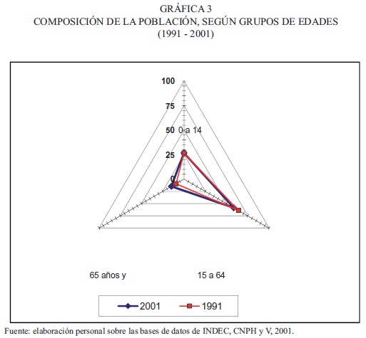El comportamiento de la relación niños-mujeres, entre 1991 y 2001, refleja el descenso en la proporción de niños (de 0 a 4 años) relacionado con las mujeres en edad fértil. También se destaca que en ese mismo lapso temporal hubo un leve incremento en la participación porcentual de los menores de 0 a 14 años, grupo etáreo que ilustra la existencia de un potencial demográfico que se sostendrá en el tiempo solo si la población joven-madura es retenida en las localidades.
