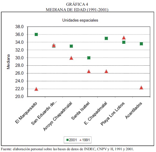 La determinación del peso que tienen los grandes grupos de edades en cada barrio ilustra la existencia de un régimen demográfico entre maduro y envejecido. Con el cálculo de la edad mediana de población (gráfica 4) se reafirma la situación de envejecimiento generalizado y en los valores obtenidos para los años 1991 y 2001 se advierte un incremento substancial, con excepciones en Playa de los Lobos y en San Eduardo de Chapadmalal.