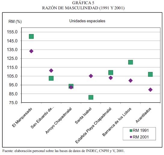 Con respecto a la composición de la población por sexo, se ha calculado la razón de masculinidad para los años 1991 y 2001 (gráfica 5). En 1991, la razón de masculinidad era alta. En el año 2001 se observa, en líneas generales, la existencia de razones de masculinidad superiores a 100, destacándose las áreas más próximas a unidades de producción agropecuaria, tales como Santa Isabel, San Eduardo de Chapadmalal y El Marquesado.