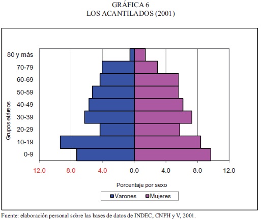La estructura demográfica se aprecia en las pirámides poblacionales de cada localidad. El barrio Los Acantilados (gráfica 6) tiene una base demográfica importante, en especial por el aporte del grupo etáreo de 10 a 19 años. A su vez, es baja la presencia de jóvenes de 20 a 29 años y se suma a esta particularidad la mayor existencia de personas entre 30 y 49 años, caracteres que señalarían la radicación de familias jóvenes con hijos menores de 20 años; otro signo de esta situación es el equilibrio entre los sexos en los grupos de 30 a 59 años.