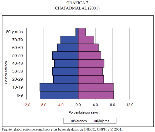 En Chapadmalal3 (gráfica 7), la base es relevante y está definida por el aporte, en similar proporción, de los grupos de 0 a 19 años. Esta localidad tendría mayor capacidad de retención demográfica de los jóvenes, o bien, sería la elegida por grupos etáreos de baja edad para iniciar la formación de familias. Se infiere que en la conformación de la estructura demográfica los matrimonios de diversas edades tendrían una notable participación, evidenciada en el equilibrio entre varones y mujeres en los grupos etáreos hasta los 49 años.