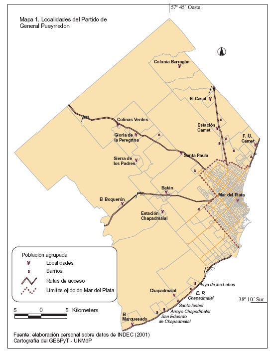 El Partido de General Pueyrredon (PGP, 564 000 habitantes, 2001), en el sudeste bonaerense (Argentina), es conocido esencialmente por las características económico-demográficas de la ciudad de Mar del Plata (524 553 habitantes,1 2001). Sin embargo, más allá de la ciudad cabecera se encuentran espacios dedicados a las actividades agropecuarias e industriales; en ellos pero agrupadas a lo largo de las rutas, se hallan localidades2 de pequeñas dimensiones cuya población no supera en ningún caso los 10 000 habitantes.