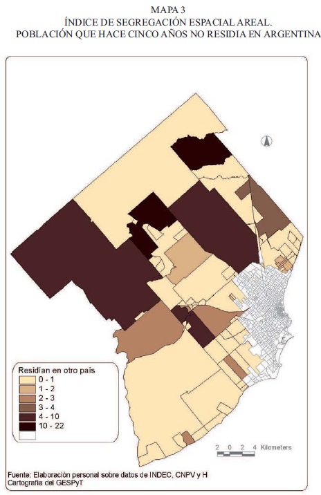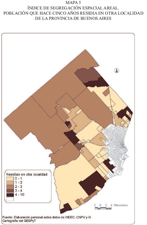 Sin embargo, los datos del Censo Nacional no permiten determinar los puntos de origen y destino de la movilidad territorial dentro del partido por lo cual se recurrió a dos tipos de análisis. En primer lugar, y para toda la unidad político-administrativa, se calcularon los índices de segregación general y areal de la variable que indica el lugar de residencia cinco años antes del Censo. Este primer acercamiento tiene por finalidad contextualizar la situación de los poblados en estudio.
