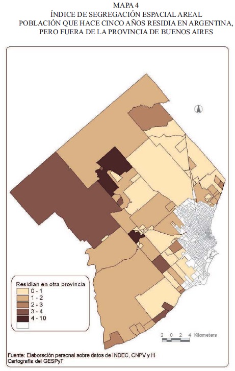 Por otra parte, el ISEA correspondiente a la población que habitaba en otras provincias expresa valores elevados de segregación en cierto sector del barrio Los Acantilados; también en Playa Los Lobos, Estafeta Playa Chapadmalal y El Marquesado. Estos serían migrantes recientes que probablemente han hallado situaciones laborales o habitacionales favorables sin necesidad de hacer una escala residencial en la ciudad de Mar del Plata.