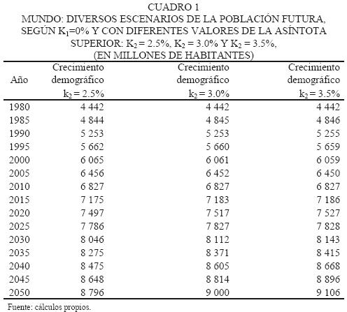 Es posible señalar que los resultados estimados de las poblaciones, derivados de la función matemática, son semejantes a los observados, lo que significa que el modelo reproduce de manera adecuada la dinámica demográfica mundial del periodo 19802005. En el cuadro 1 se presentan los resultados de los tres escenarios.